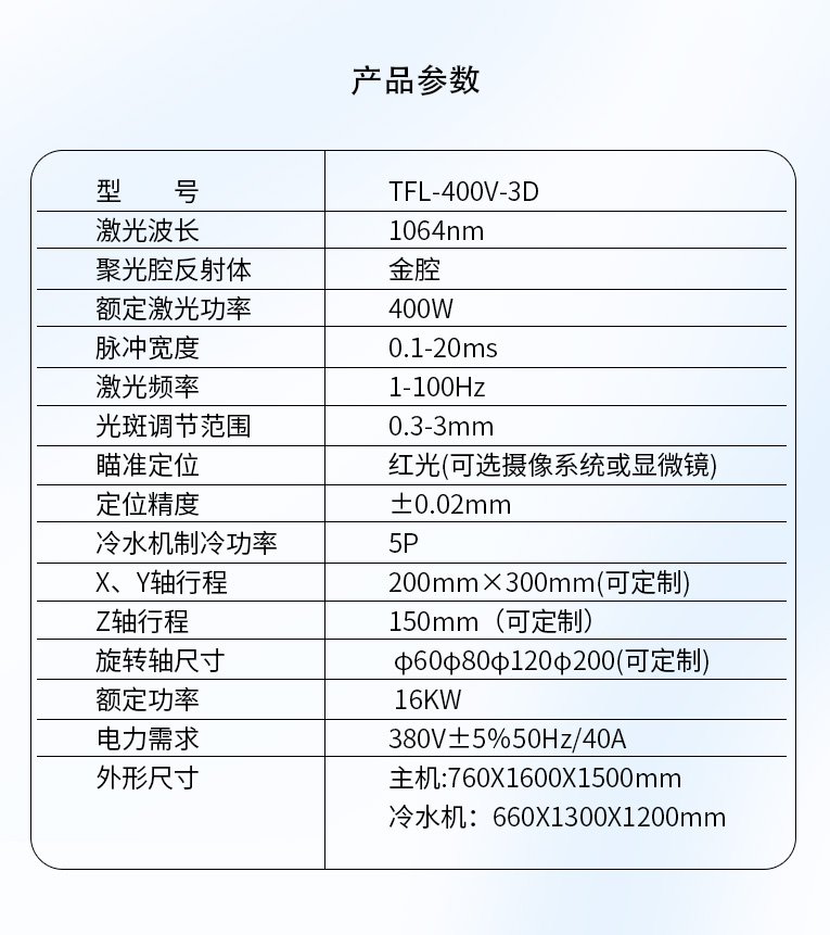 1、TFL-400V/500V-3D,由雙路氙燈泵浦、進口陶瓷反射腔體及Nd:YAG晶體棒構成激光器,電光轉換效率高。