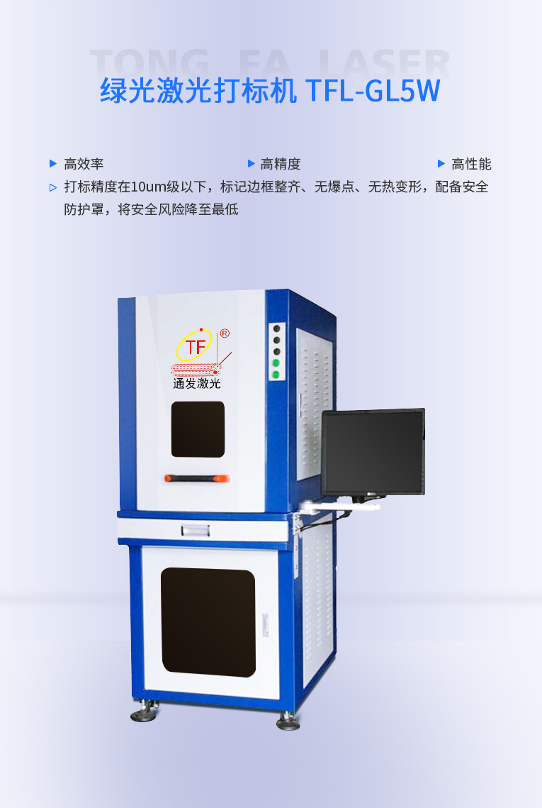 通發(fā)激光研發(fā)的TFL-GL3W/5W 綠光激光打標(biāo)機(jī)配備安全防護(hù)罩,避免設(shè)備操作員誤操作引起的人身傷害,將安全風(fēng)險(xiǎn)降至最低,產(chǎn)品遠(yuǎn)銷海內(nèi)外.打標(biāo)精度在10μm級(jí)以下,標(biāo)記邊框整齊、無爆點(diǎn)、無熱變形,有效提高加工的成品合格率,使用壽命長、配合全封密光路、特別加固的光路底座滿足長期、穩(wěn)定性的工作需要。