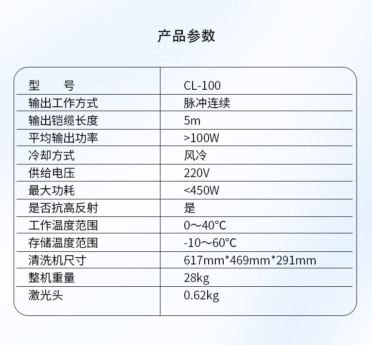 清洗機手持激光頭外觀簡潔、小巧輕便,可以長時間手持使用,按鍵與手柄一體化設計,簡單易用。內置掃描系統(tǒng)采用小型高速電機及驅動 ,主體為一體化加工成型,堅固防塵且穩(wěn)定耐用。激光頭采用了創(chuàng)新的紅光輔助尋焦設計,可利用紅光指示輕松找到不同場 鏡下的對焦位置,解決了市場上現有產品對焦不準確以及調節(jié)方式單一的問題。